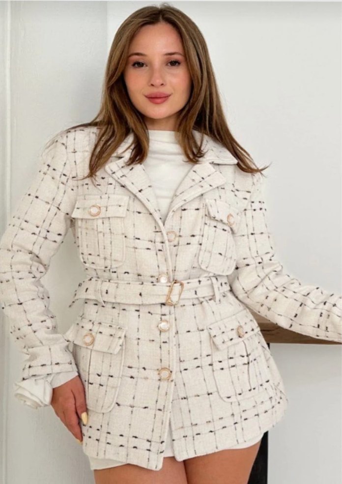 Düğmeli, ekose desenli beyaz mini ceket, kesik yaka ve uzun kolludur. Belde kemer ve rahat kesimle sentetik yumuşak kumaştan üretilmiştir.