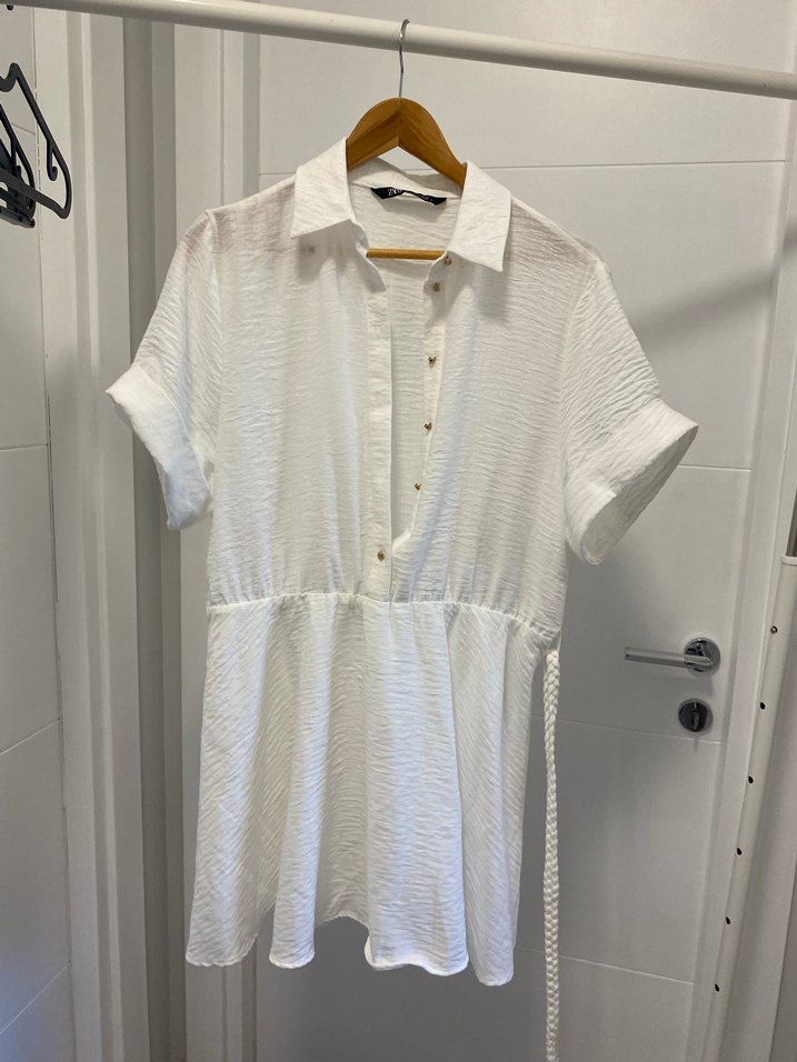 Kısa kollu, düğmeli ve yakalı beyaz gömlek elbise Bol kesimi ve mini boyuyla rahat bir günlük stil sunar.