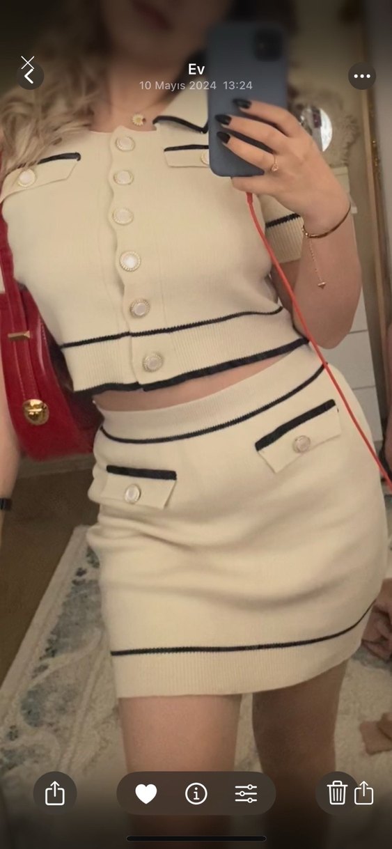 Düğmeli ve siyah şerit detaylı, beyaz, dar kesim mini etek. Pürüzsüz sentetik kumaştan, trend sokak stili için uygun.