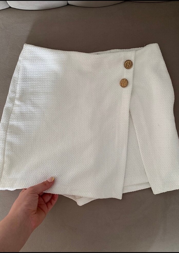 Düğmeli beyaz mini etek, dar kesim ve düz dokusuyla günlük sokak stili için uygundur. İç etiketi kesildi ama orjinal zara etek