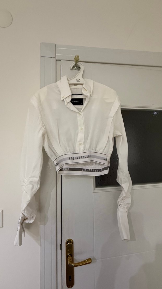 Düğmeli, uzun kollu beyaz gömlek, yakalı ve kısa kesim. Markalı elastik etekliğiyle sokak ve athleisure tarzını birleştirir. Rahat kombinler için uygun. Bir kaç kez giyildi yeni gibidir