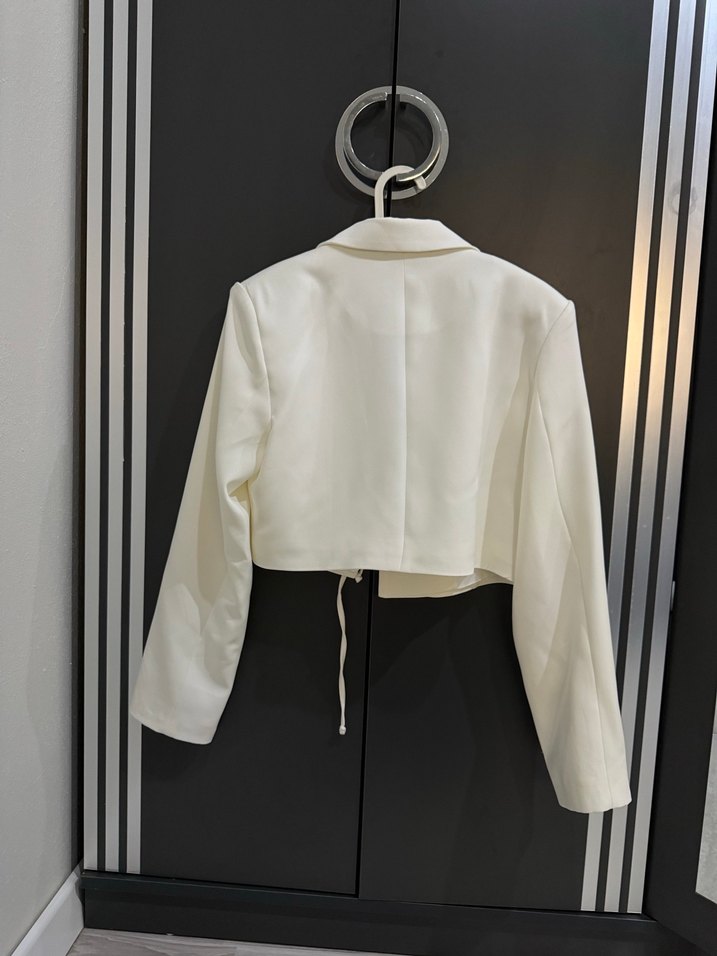 Düğmeli, kısa kesim beyaz blazer ceket, uzun kollu ve yaka detayı ile minimalist tarzda şık bir görünüme sahiptir. ✨