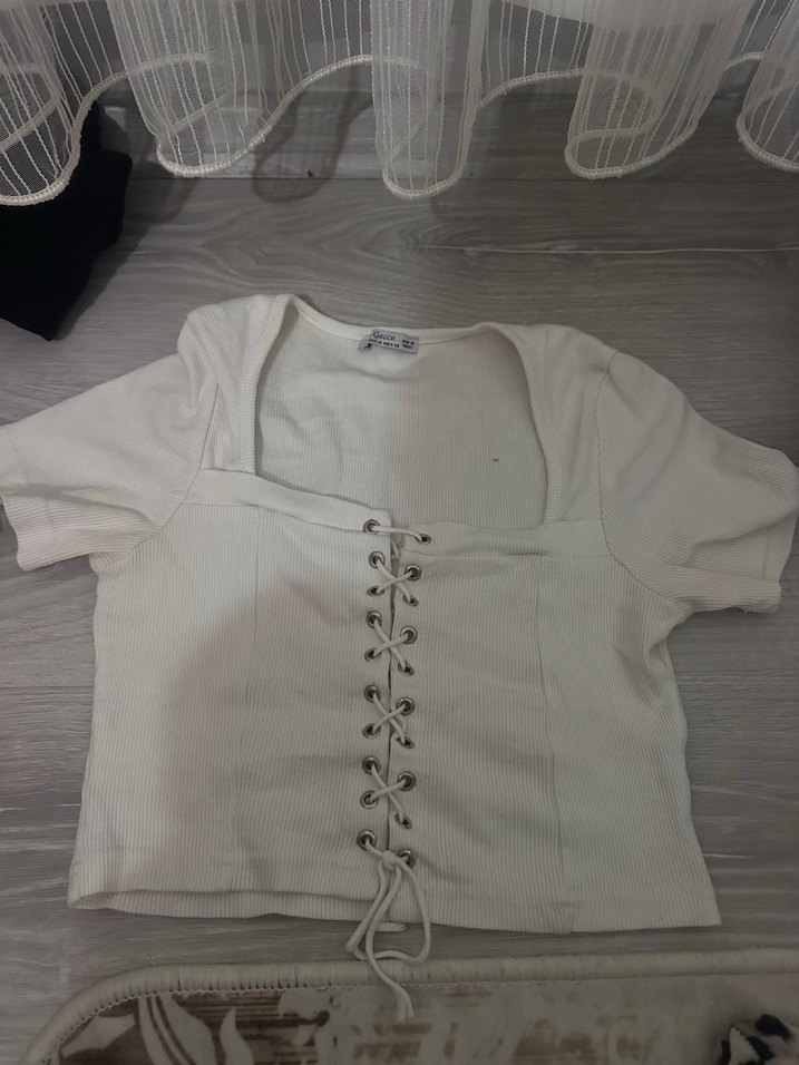 Düğmeli beyaz mini bluz, tekne yaka ve kısa kollu, ön kısmında düğme detaylı, yumuşak sentetik kumaştan üretilmiştir. Günlük sokak stili için uygun.