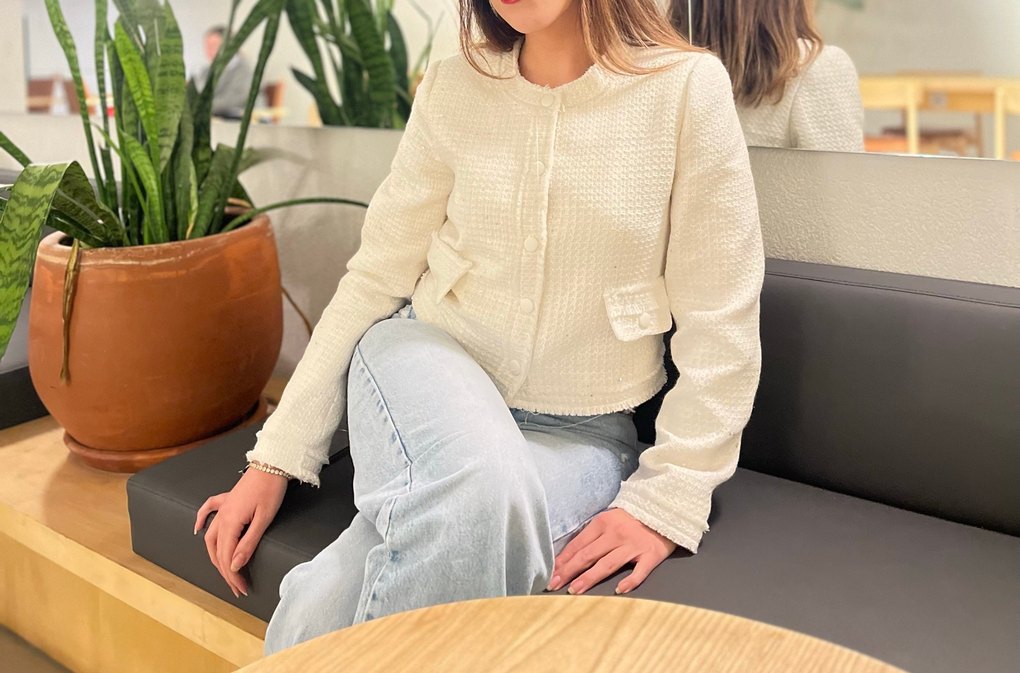 Düğmeli, işlemeli beyaz mini kadın ceket. Modern klasik tarzda, uzun kollu ve parlak sentetik kumaştan, ofis kullanımı için uygundur. ✨