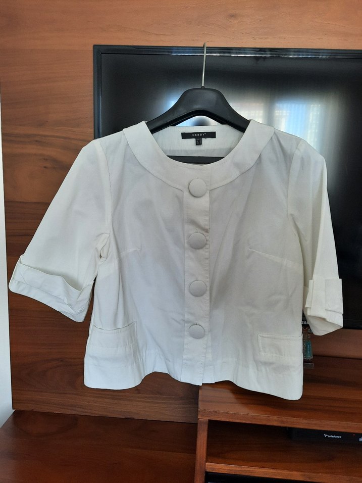 Sayılı giyildi. Temiz ve yeni durumda. Hiçbir sorunu yok. Pamuk kumaştan, düğmeli ve kısa kollu beyaz mini ceket. Notched lapel yakası ve rahat kesimiyle ofis veya günlük kullanım için uygundur.