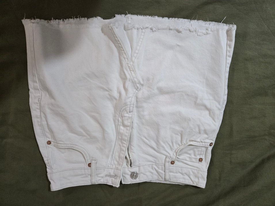 beyaz kot şort etek. Mini boy ve yıpranmış etek ucu, günlük kullanım için rahat bir sokak stili sunar.