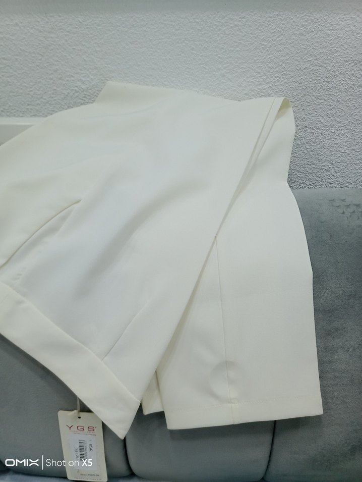 Düğmeli beyaz mini kadın kumaş pantolon, düz kesim ve sentetik dokulu kumaştan üretilmiştir. Ofis için minimalist tarzda uygundur.