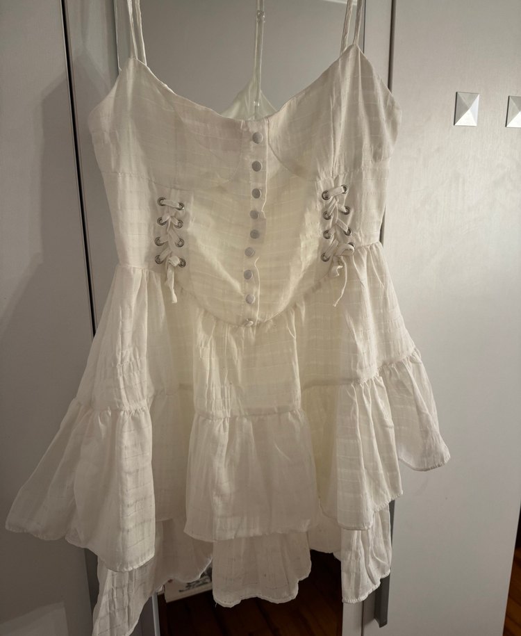 Düğmeli mini keten beyaz elbise. Ankara Tunalıda butikten aldım. Yalnızca bir kere mezuniyetimde giydim. Üstümdeki en net halini son fotoğrafa ekledim. (54 kilo/1.60 boyundayım)