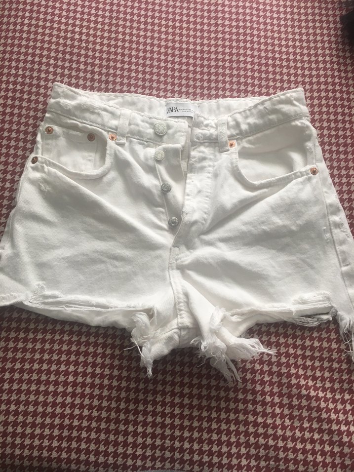 Düğmeli kapanışlı, pamuklu beyaz mini kot şort, bol kesim ve yıpranmış etek ucu detayına sahip, günlük sokak stiline uygun.