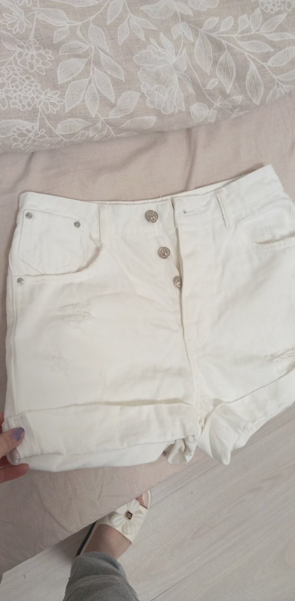 Pamuklu beyaz mini kot şort, düğmeli ve bol kesim. Günlük sokak stili için uygundur.