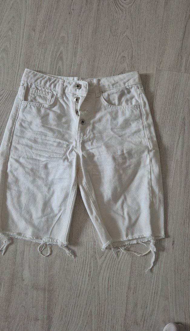 Pamuklu, düğmeli beyaz mini kot şort, bol kesim ve günlük sokak stili ile rahat bir kullanım sunar.