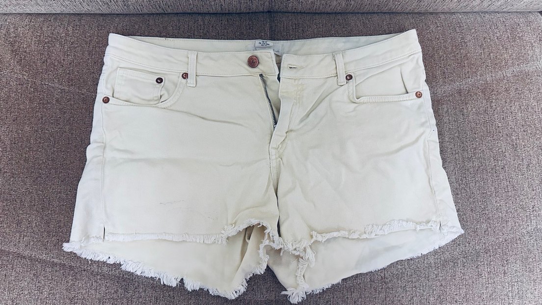 Düğmeli sarı pamuklu şort, bol kesim ve kısa paçalıdır. Etek ucu püsküllü, rahat sokak stiline uygundur.