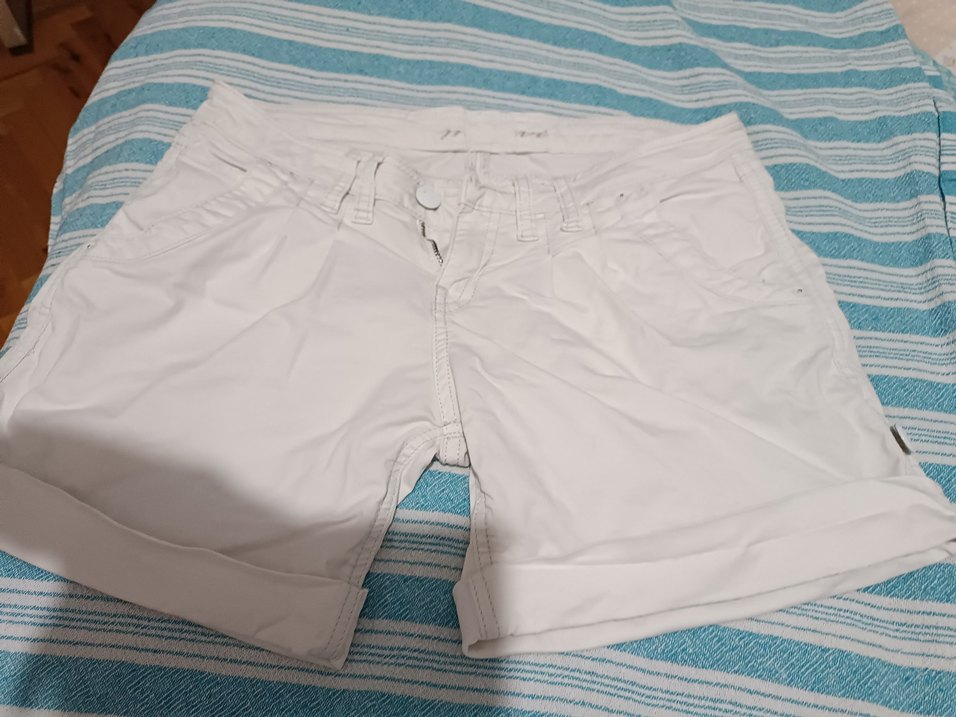 Pamuk kumaştan yapılmış, düğmeli ve kısa kesim beyaz şort. Rahat ve şık, günlük ve sokak stili için uygundur.