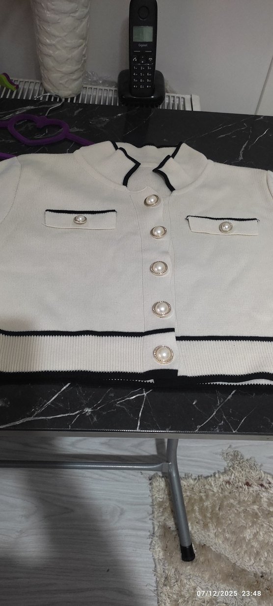 Düğmeli ve inci düğmeli kısa kollu, yakalı beyaz triko hırka. Siyah detaylı kısa kesim, günlük rahat stil için uygun. boyu.38.cm.iki.kol.arasi 45.cm urun yumusacik ve.cik.kaliteki sadece 1.kez.giyildi