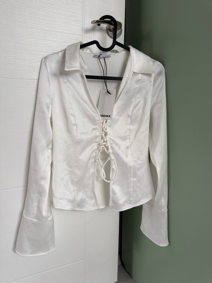 Düğmeli, V yaka ve mini uzunlukta beyaz, vücuda oturan kadın gömlek. Pürüzsüz sentetik kumaştan BERSHKA HİÇ KULLANILMADI