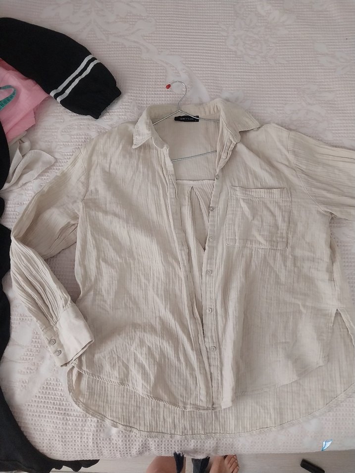Yumuşak müslin kumaştan, düğmeli ve yakalı, bol kesim bej tonlarında kadın gömlek. Uzun kollu, midi boyda, gündelik bohem tarzda rahat kullanım sağlar. az kullanıldı deforme yok.