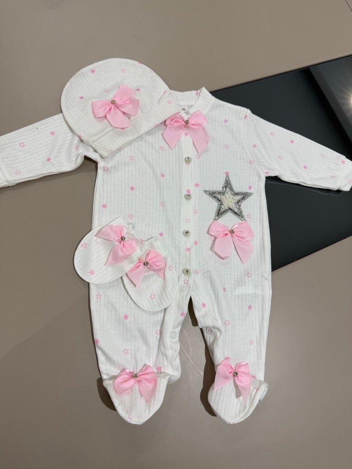 Düğmeli beyaz nakışlı bebek kız hastane seti, pembe fiyonk detaylı tulum, şapka ve eldiven içerir. ⭐