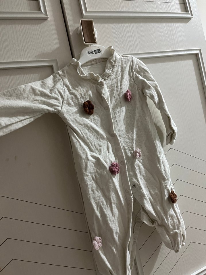 Düğmeli, pastel beyaz renkte, nakış işlemeli bebek kız tulumu. Uzun kollu ve yumuşak kumaşlıdır.