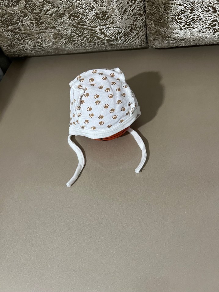 Beyaz renkte, nakış desenli ve düğmeli askıları olan bohem tarzda bebek şapkası.
