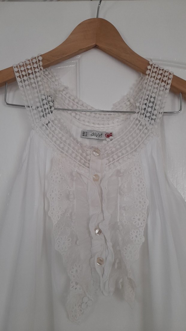 Uzun, kolsuz beyaz bluz, V yaka ve düğmeli ön kısmı nakışlıdır. Yumuşak pamuktan, bol kesim ve vintage bohem tarzda.