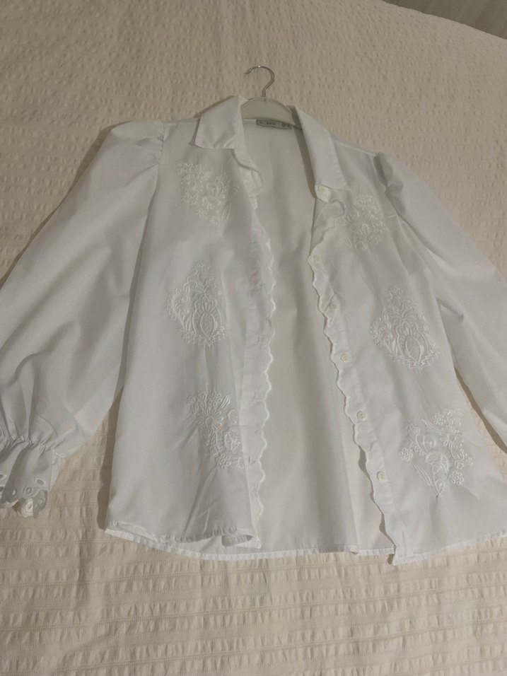 Pamuklu, uzun kollu, düğmeli ve yakalı beyaz gömlek. Nakış detayları ve bol kesimiyle bohem ve retro tarzını yansıtır, ofis için uygun. Hiç giyilmedi