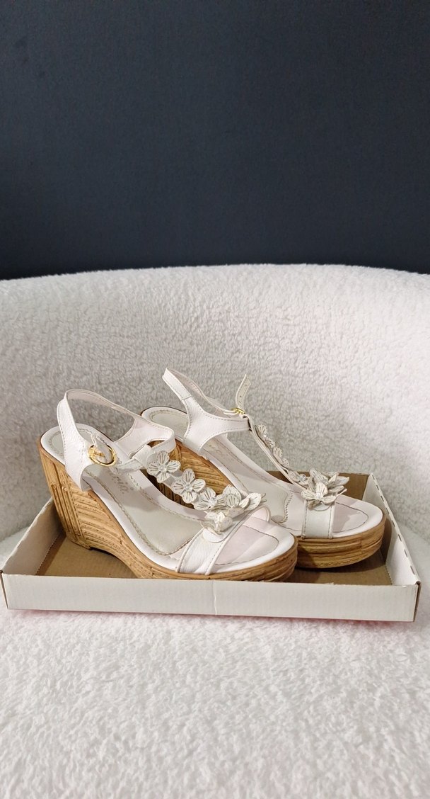 Düğmeli kayış ve nakışlı çiçek detaylarına sahip beyaz dolgu topuklu kadın sandalet. Kauçuk tabanlı, klasik ve bohem tarzda düğünler ve günlük kullanım için uygun.