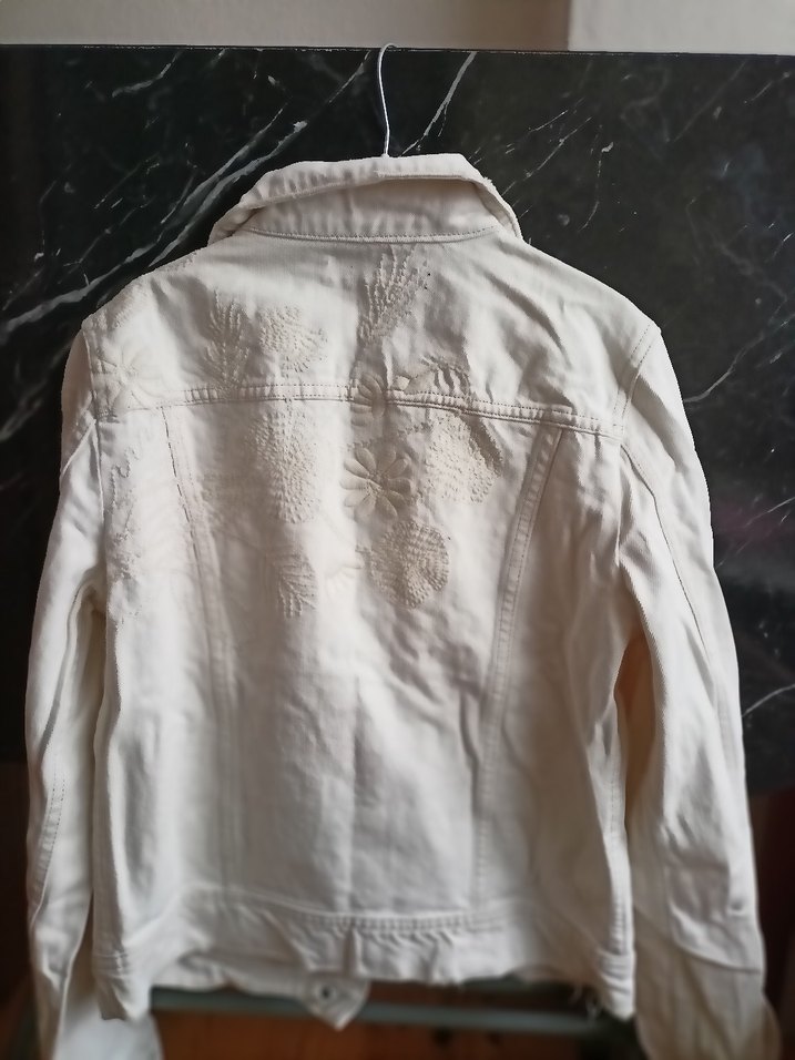 Düğmeli, yakalı ve nakış detaylı beyaz kadın kot ceketi. Uzun kollu ve normal kesimdir. Bohem tarzda, günlük kullanım için uygundur.