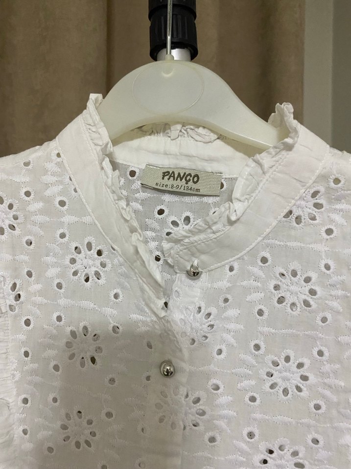 Düğmeli, kısa kollu beyaz pamuk gömlek, nakışlı desenli ve yakalıdır. PANCO markasına ait, bohem tarz için uygun, bol ve kısa kesimdir.