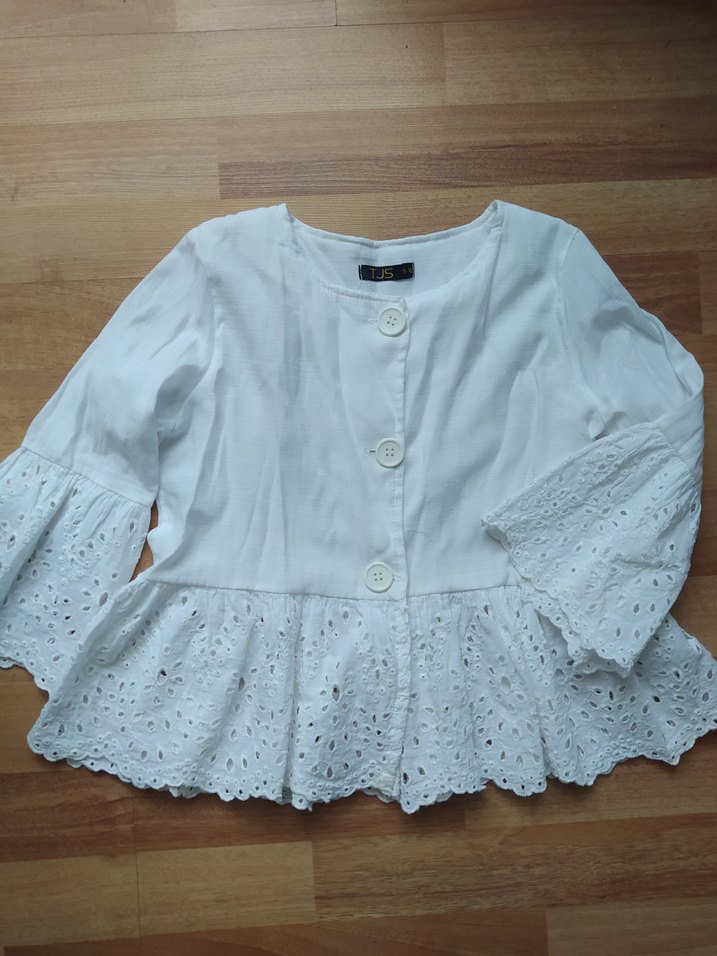 Beyaz pamuk kumaştan, uzun kollu, düğmeli ve nakış detaylı, bol kesim kısa uzunlukta, vintage bohem tarzında bir bluz.
