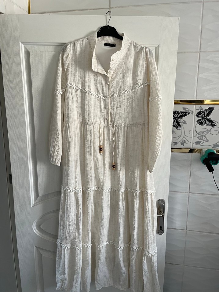 Beyaz uzun keten elbise, düğmeli, nakış detaylı, bol kesim ve uzun kollu, içi astarlı V yakalıdır. Bohem tarz için uygundur.