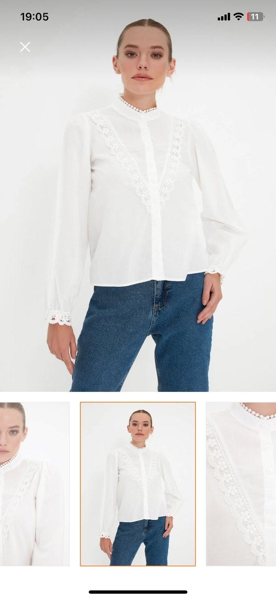 Bu beyaz pamuk gömlek, V yakalı ve düğmeli ön kapamalıdır. Nakış detayları, dantel manşetler ve rahat midi boy uzunluğu ile günlük sokak stili sunar.