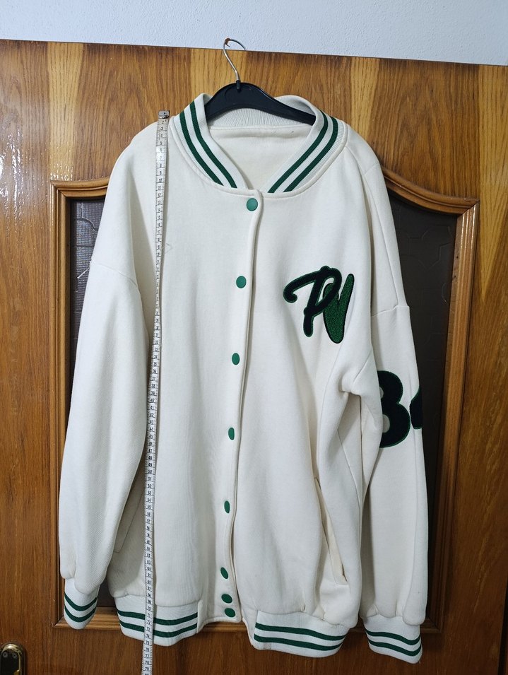 Düğmeli, baskılı, beyaz renkte, bol kesim, uzun kollu ve normal boyda yumuşak ve sıcak kumaştan üretilmiş kadın ceket.