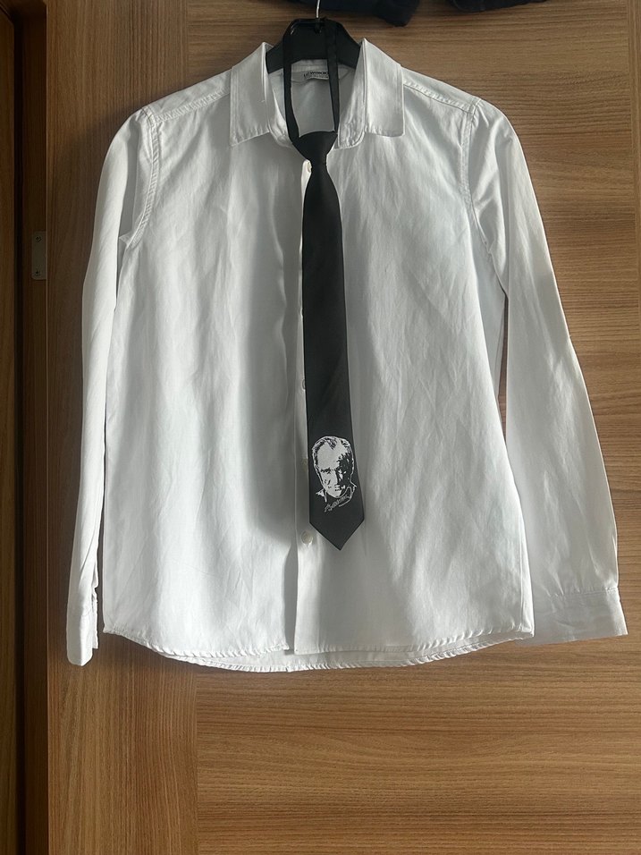 Düğmeli, notç yaka ve uzun kollu beyaz pamuk gömlek. Düzenli kesim ve gri tonlarında hafif batik desenli, iş ortamına uygun goth ve punk tarzında.