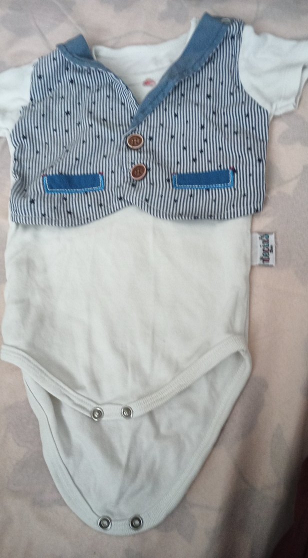 Düğmeli, çizgili yelek görünümlü, beyaz pamuklu, kolsuz bebek body. Notch yakalı ve rahat kullanımlı.