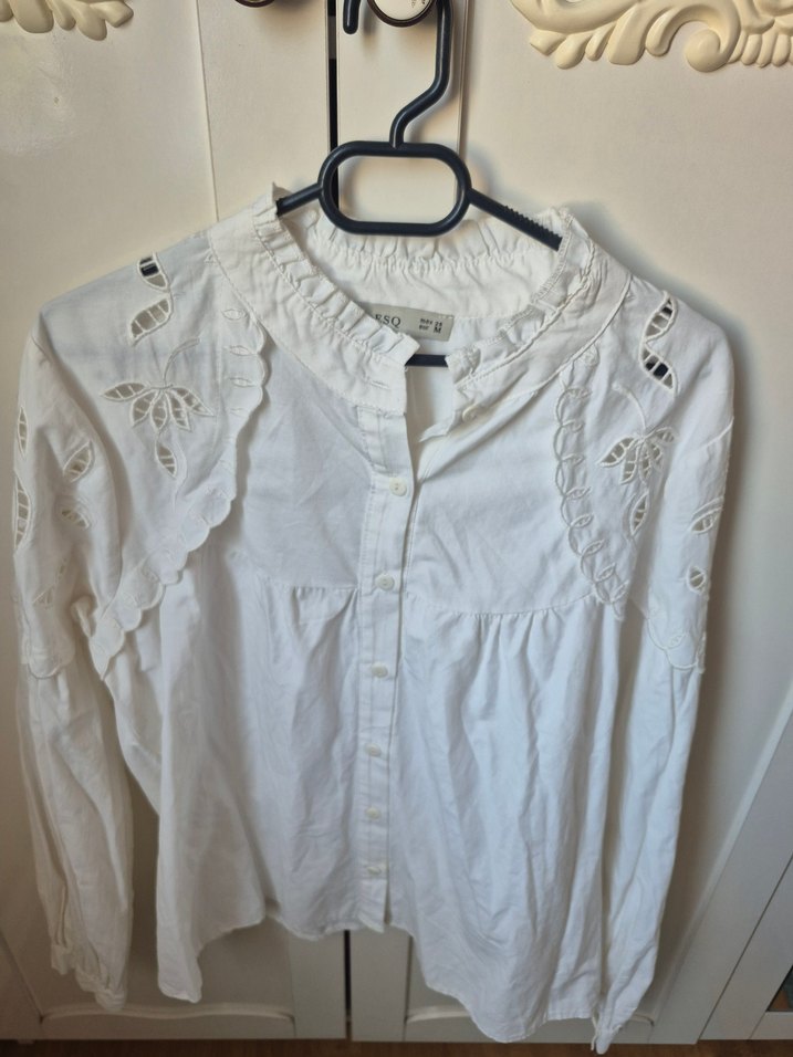 Beyaz pamuklu gömlek, düğmeli ve yakalıdır. Omuzlarda dekoratif kesim detayları bulunur. Uzun kollu ve bol kesimdir, bohem tarzına uygundur.