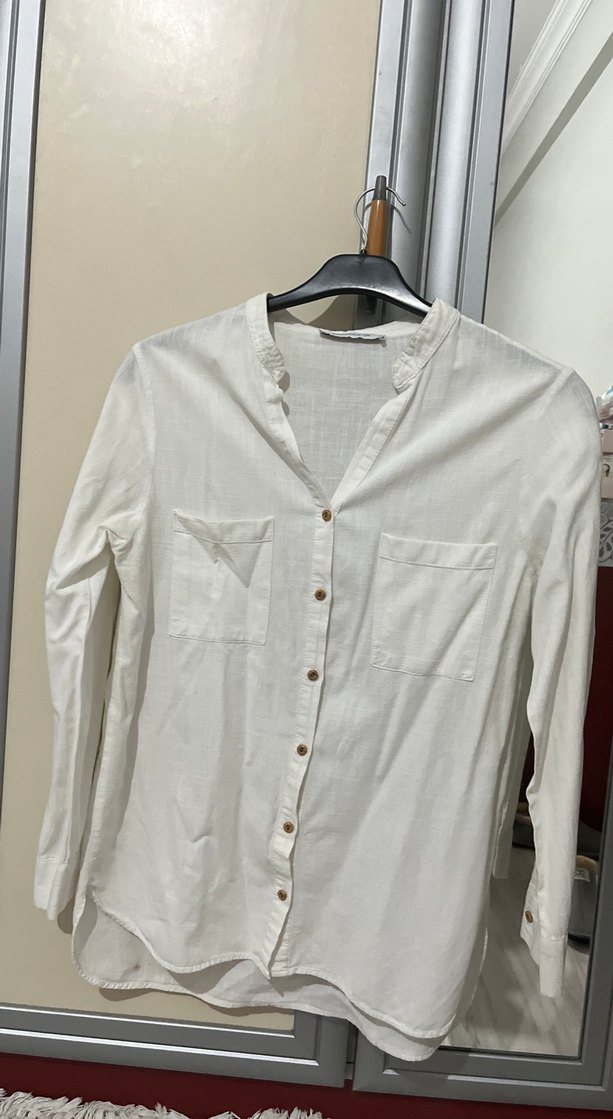 Düğmeli, uzun kollu, pamuklu beyaz gömlek. Bohem tarzda, rahat kesimli, iki ön cepli, günlük kullanıma uygun.