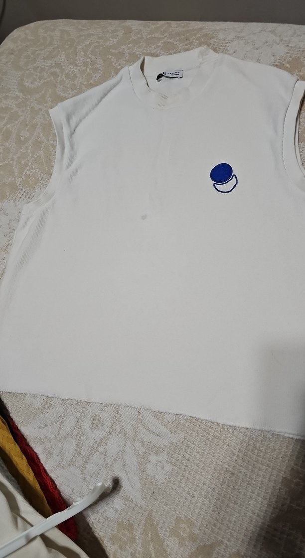 Düğmeli, beyaz pamuklu, kolsuz hamile tişörtü. Yuvarlak yaka ve rahat kesim, günlük kullanım için uygundur.