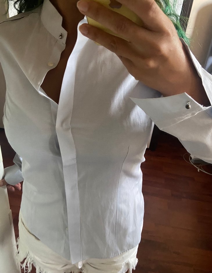 Düğmeli önü ve yakalı, pamuklu kumaştan yapılmış beyaz, vücuda oturan gömlek. Uzun kollu ve normal midi boyda, ofis için uygun.
