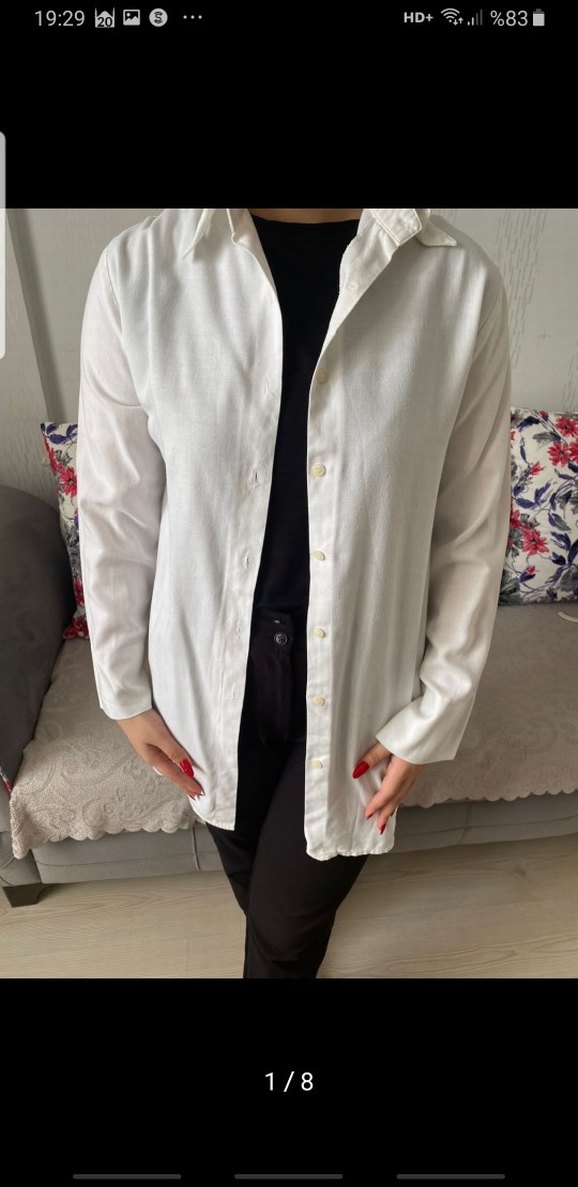 Düğmeli önü ve kesimli yaka detaylı beyaz kadın gömlek. Uzun kollu, pamuklu ve rahat kesim, günlük rahat stil için uygundur.
