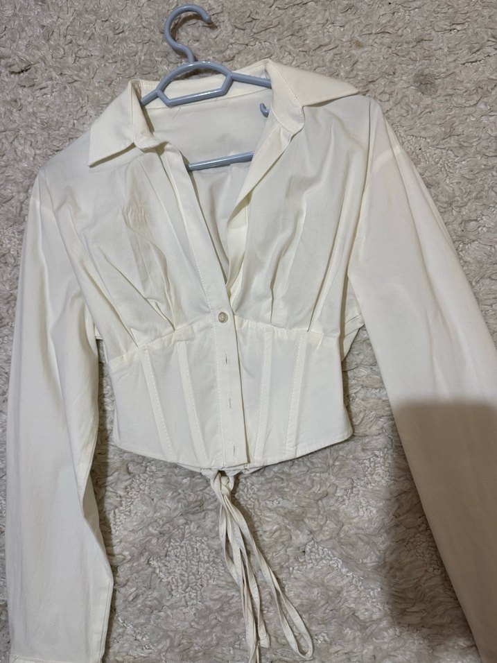 Düğmeli, uzun kollu, yakalı ve pamuklu kumaştan yapılmış beyaz, vücuda oturan kadın gömleği. Midi boy ve şık sokak tarzı tasarıma sahip, ofis için uygun.