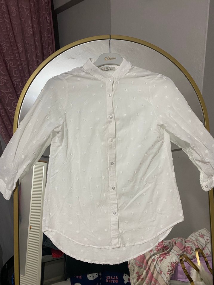 Düğmeli, uzun kollu, yakalı ve pamuklu beyaz gömlek. Salaş kesimiyle günlük kullanıma uygun, Paris tarzı sokak modası etkisi taşıyor.