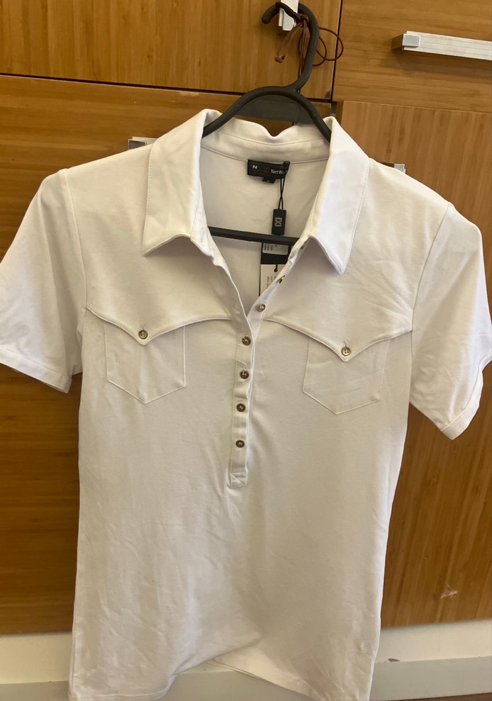 Düğmeli ve yakalı Network kadın tişört, hiç kullanılmadı. Etiketi üzerindedir.