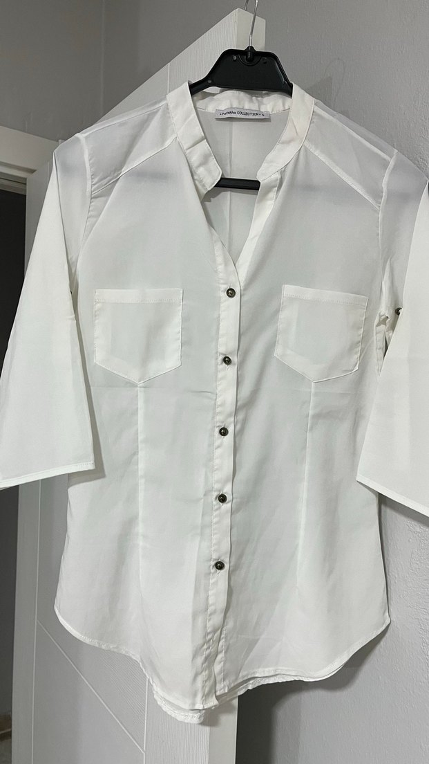 Beyaz pamuklu kadın gömlek, düğmeli, yakalı ve kısa kolludur. Normal uzunlukta, rahat kesimle ofis ve günlük kullanım için uygundur. ✨