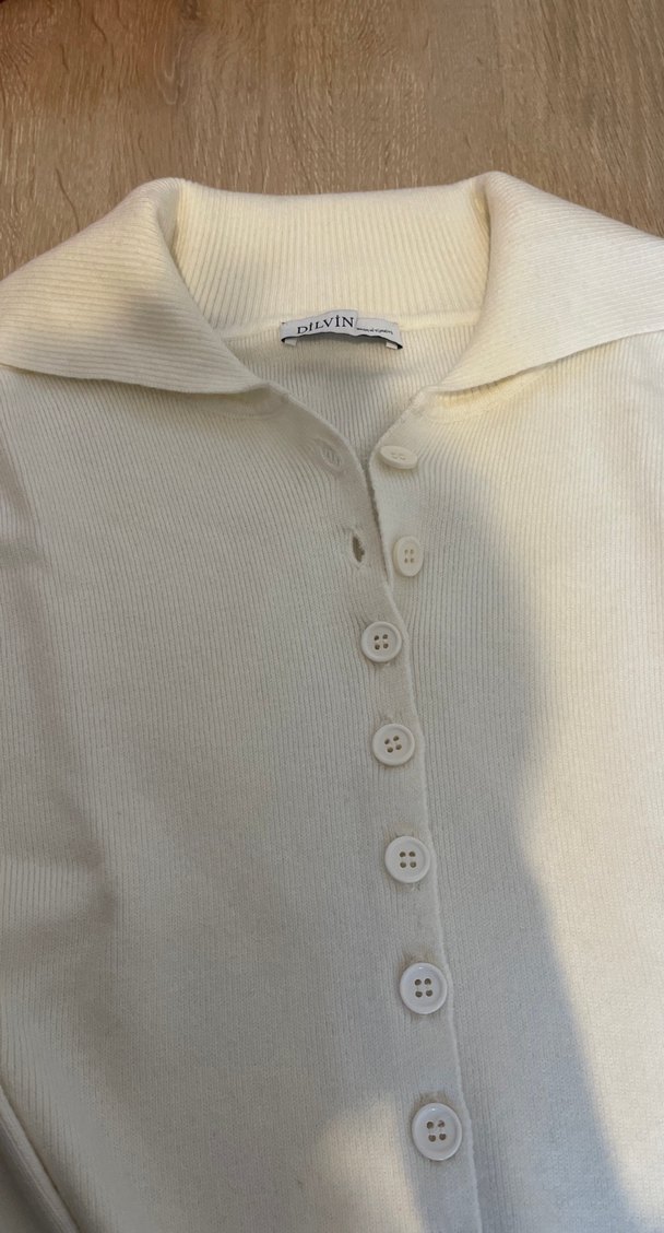 Düğmeli ön kısmı, yakalı ve uzun kollu, pamuklu beyaz kumaştan yapılmış, vücuda oturan normal boy kadın kazak. Günlük kullanıma uygundur.