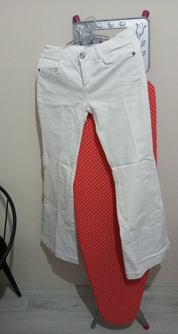 Düğmeli, pamuklu, beyaz renkli, İspanyol paça, dar kesim kadın pantolon. Günlük kullanıma uygun, rahat ve şık sokak stili.