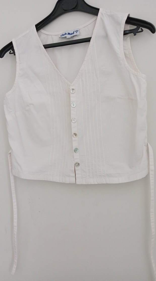 Düğmeli, V yakalı beyaz pamuklu yelek, rahat kesim ve normal midi boyda, günlük kullanıma uygundur. yeni 100 TL son fiyatıdır.Club Med markası (Fransız tatil köyü)