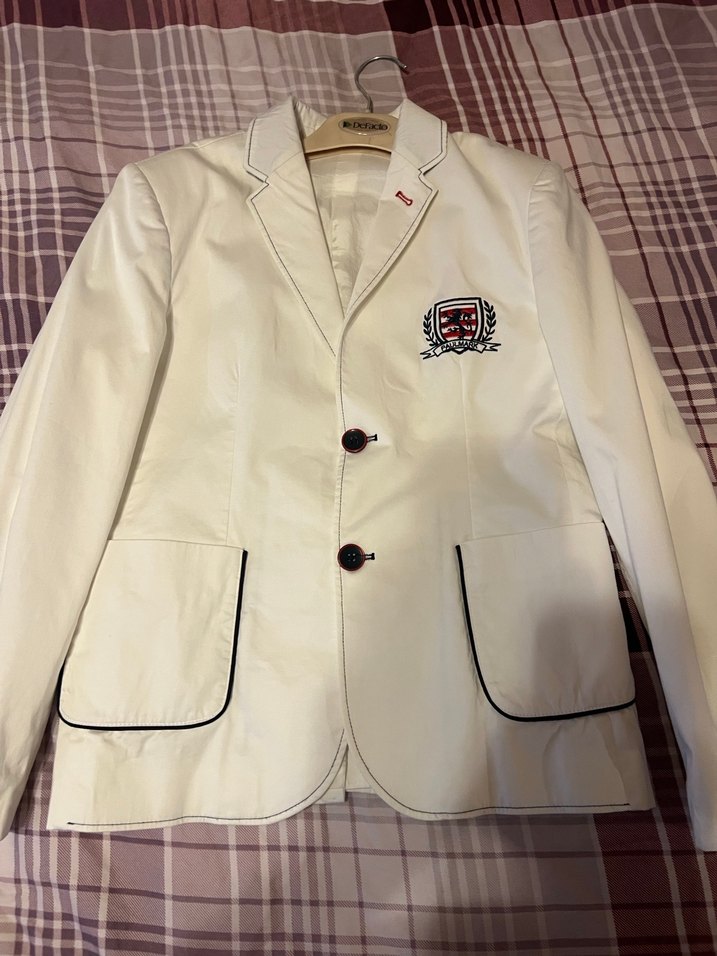 Beyaz pamuklu ceket, düğmeli ön kısmı ve kesik yaka ile düzenli kesime sahiptir. Uzun kollu, ceplerinde siyah şerit ve göğüste işlemeli amblem bulunur. Ofis için uygun, Paris sokak stili dokunuşlu.