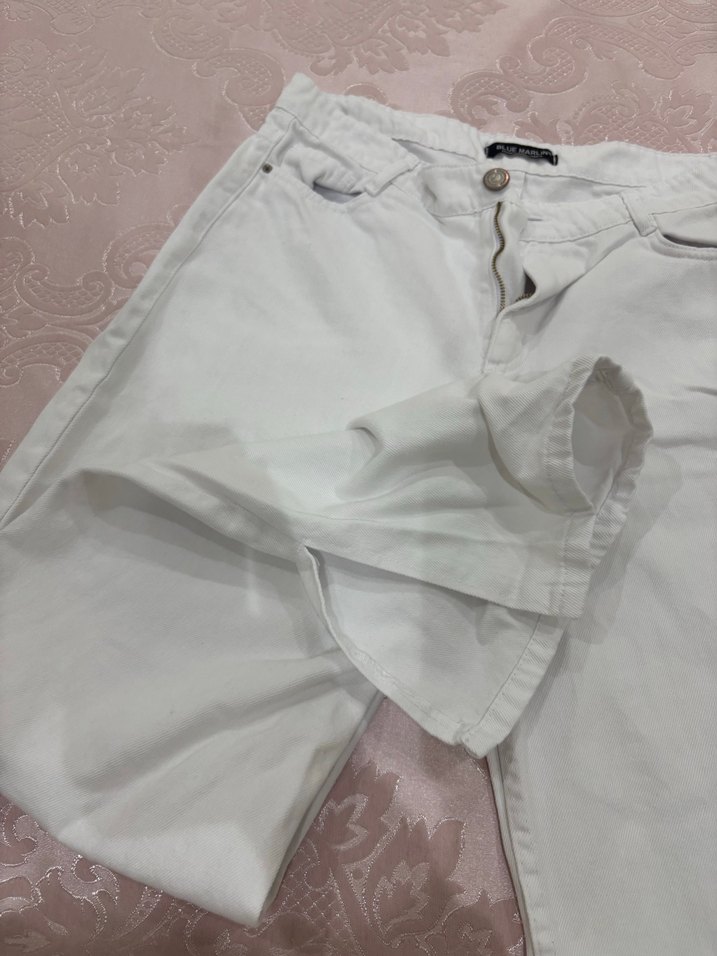 Düğmeli, beyaz pamuklu, rahat kesim, midi boy, desensiz kadın pantolon. Günlük ve sokak stili için uygundur.