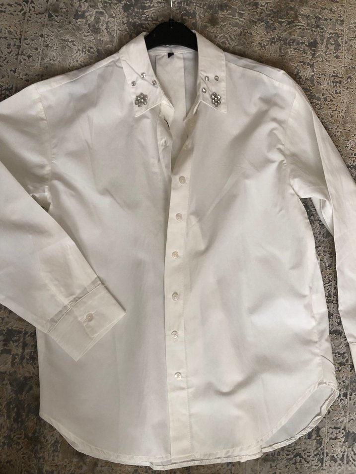 Düğmeli beyaz pamuklu gömlek, yakalı ve uzun kolludur. Normal kesim ve parlak yüzeye sahiptir, ofis için uygun Paris tarzı sokak giyimi. ✨