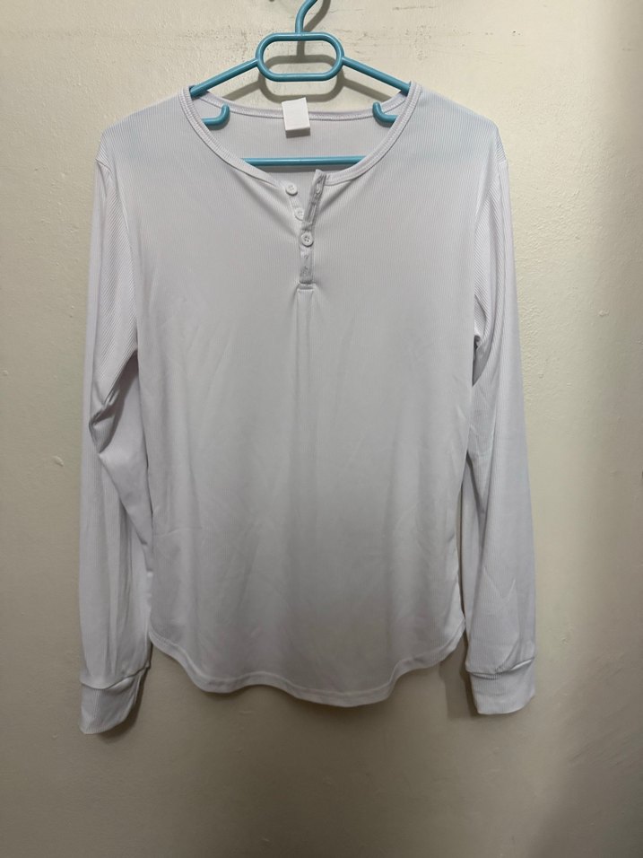 Beyaz, uzun kollu, düğmeli ve yuvarlak yakalı pamuklu bluz. Rahat kesimiyle gündelik kullanıma uygundur.